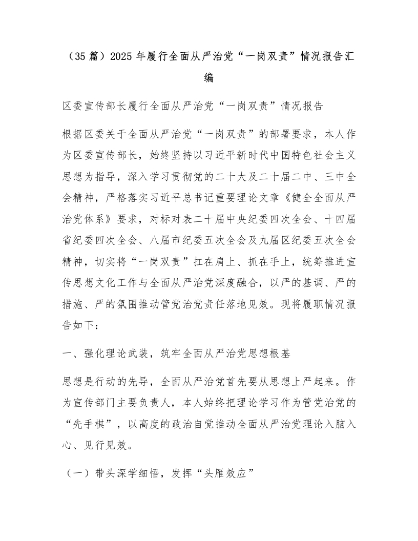 (35篇)2025年履行全面从严治党“一岗双责”情况报告汇编