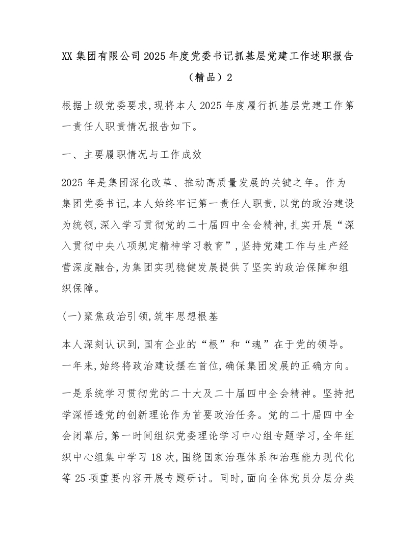 XX集团有限公司2025年度党委书记抓基层党建工作述职报告(精品)2