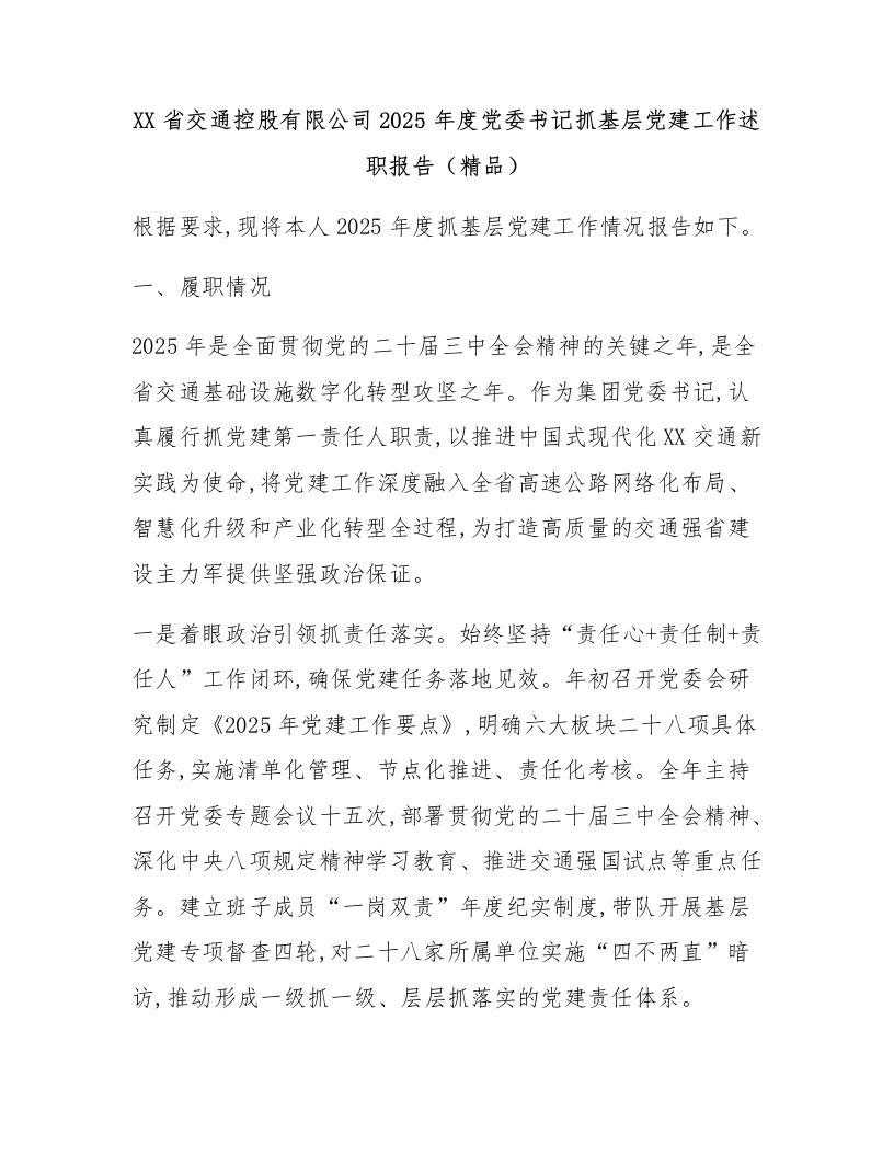 首页报告总结报告总结XX省交通控股有限公司2025年度党委书记抓基层党建工作述职报告(精品)
