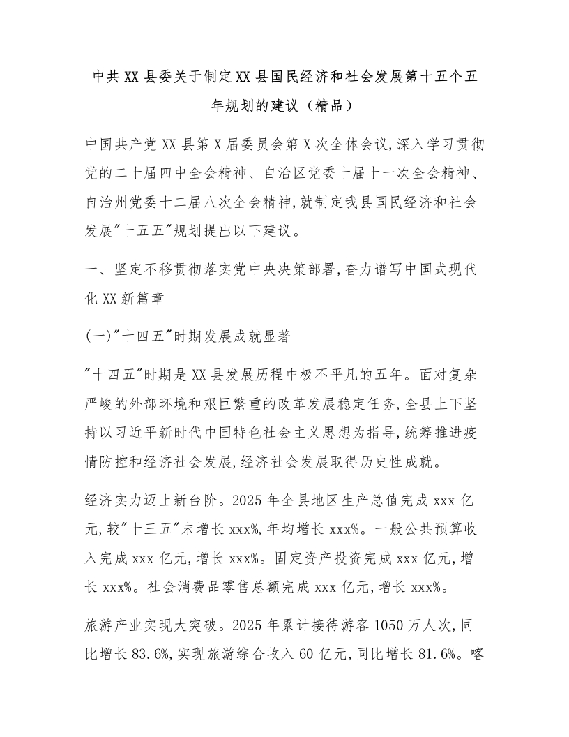 中共XX县委关于制定XX县国民经济和社会发展第十五个五年规划的建议(精品)