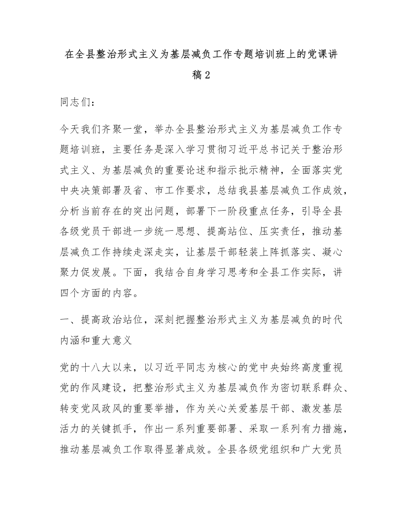 在全县整治形式主义为基层减负工作专题培训班上的党课讲稿2