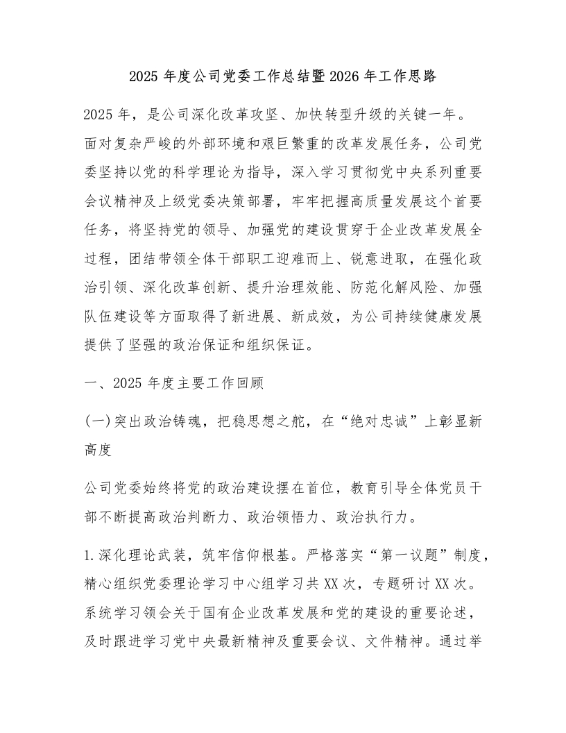 首页热门分类工作总结2025年度公司党委工作总结暨2026年工作思路