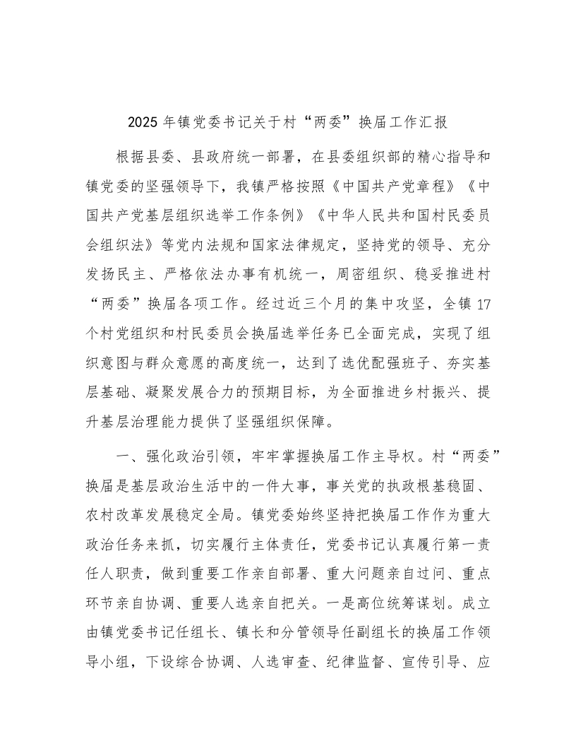 首页热门分类工作总结乡镇书记关于村“两委”换届工作总结汇报
