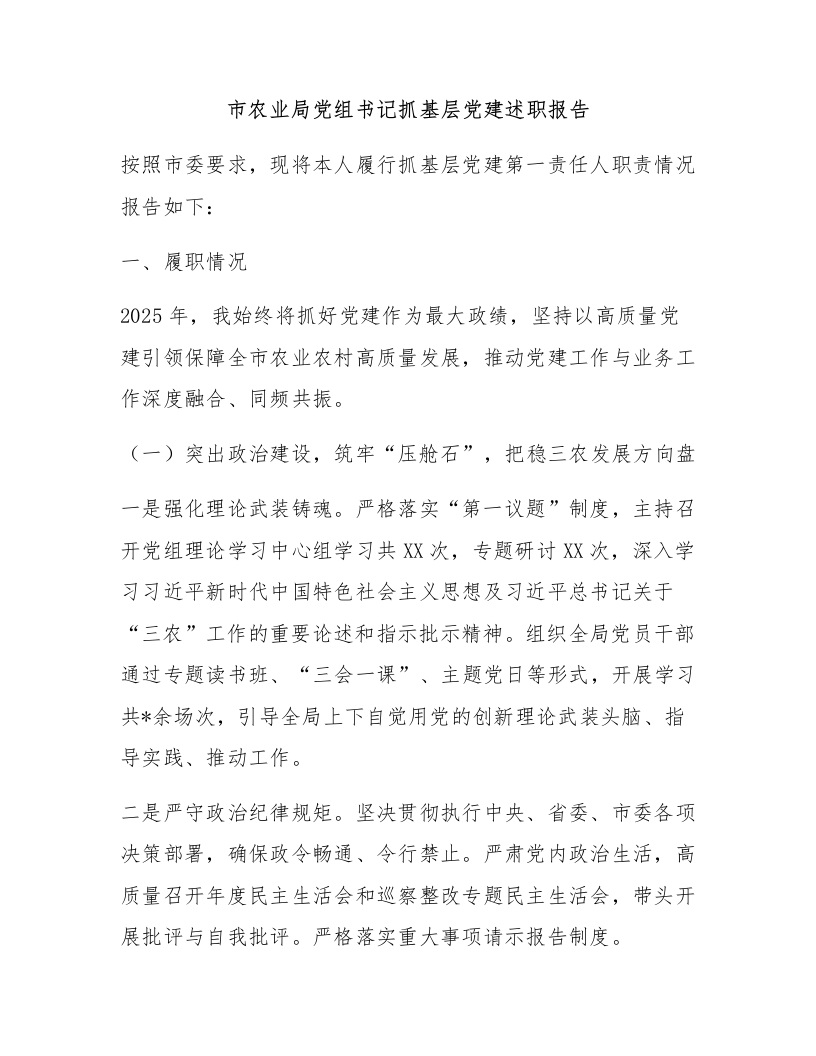 首页报告总结述职述廉市农业局党组书记抓基层党建述职报告