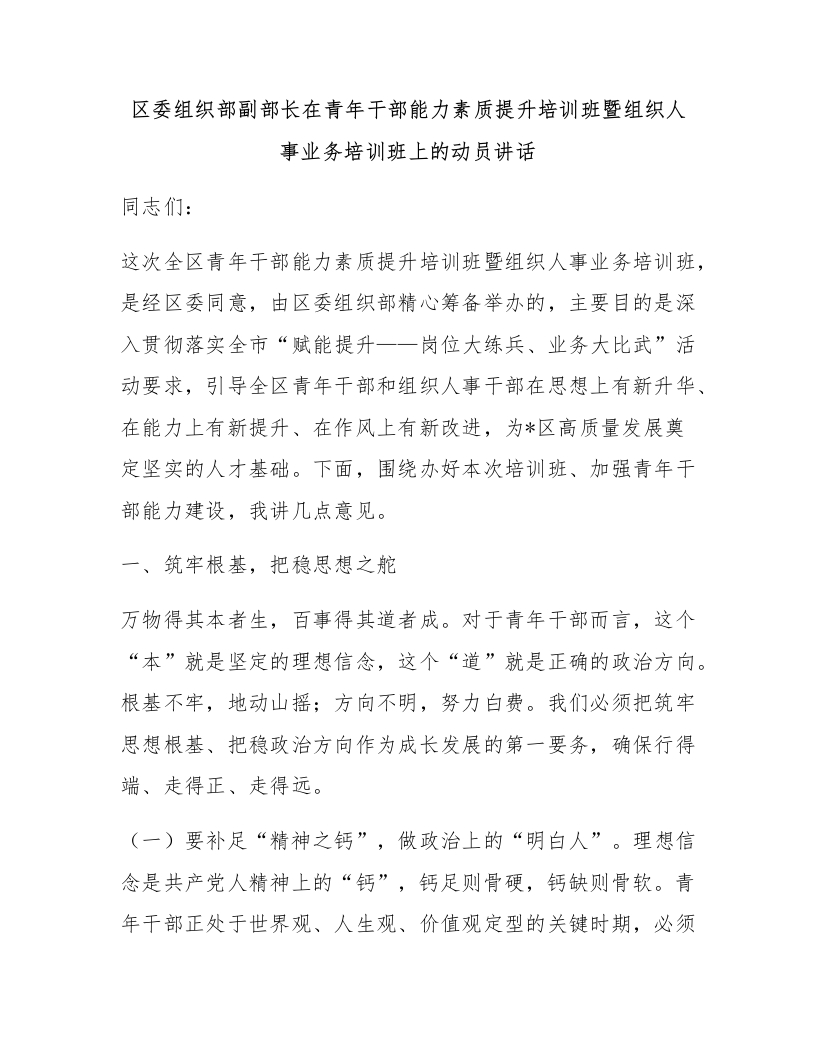 区委组织部副部长在青年干部能力素质提升培训班暨组织人事业务培训班上的动员讲话