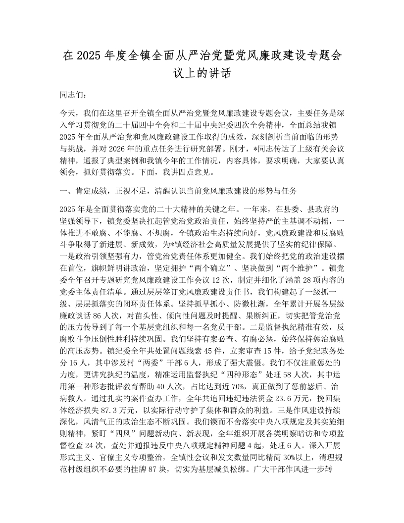 在2025年度全镇全面从严治党暨党风廉政建设专题会议上的讲话