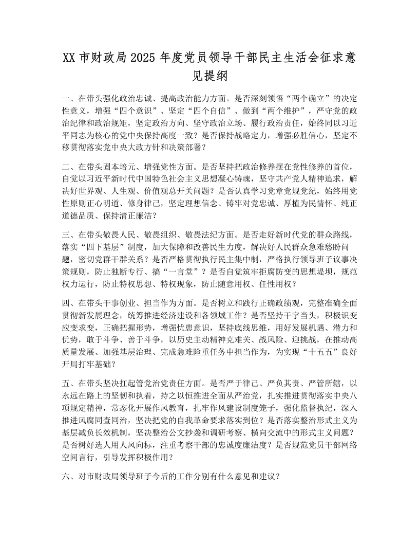XX市财政局2025年度党员领导干部民主生活会征求意见提纲