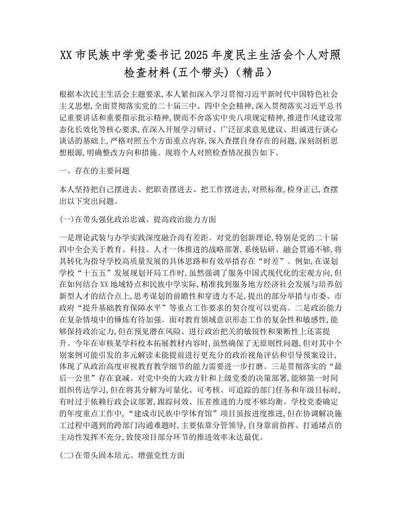 XX市民族中学党委书记2025年度民主生活会个人对照检查材料(五个带头)(精品)