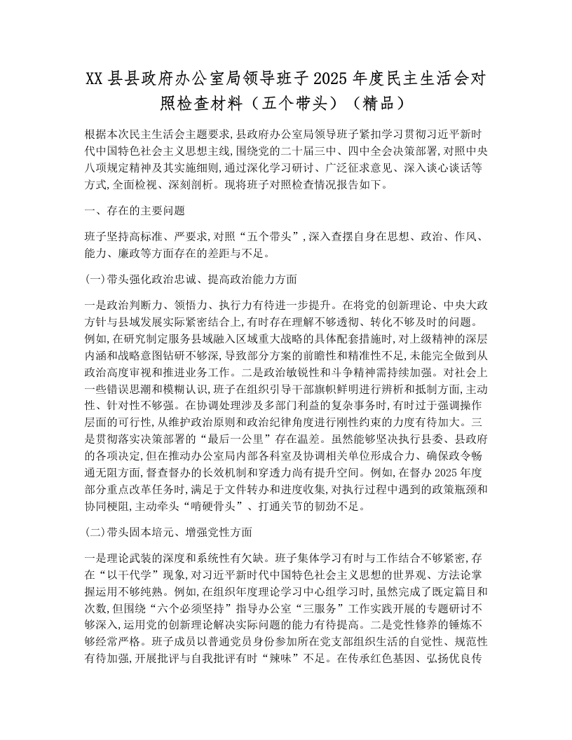 XX县县政府办公室局领导班子2025年度民主生活会对照检查材料(五个带头)(精品)