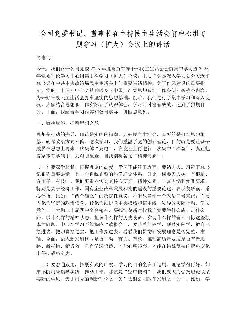 公司党委书记、董事长在主持民主生活会前中心组专题学习(扩大)会议上的讲话