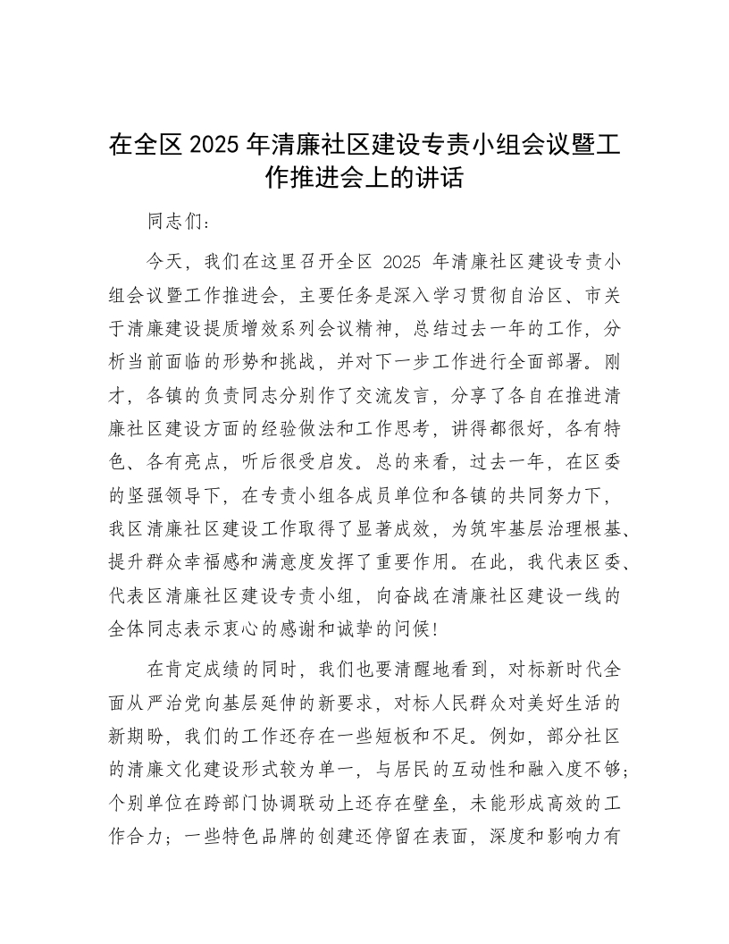 在全区2025年清廉社区建设专责小组会议暨工作推进会上的讲话