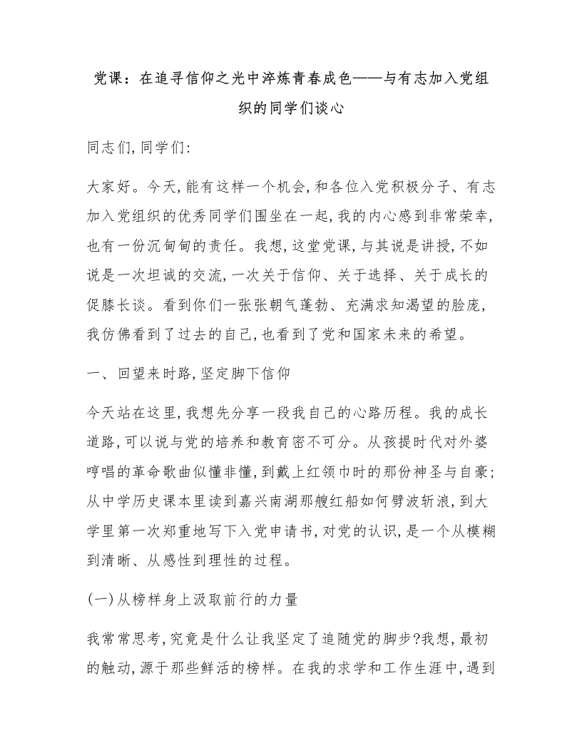 党课:在追寻信仰之光中淬炼青春成色——与有志加入党组织的同学们谈心