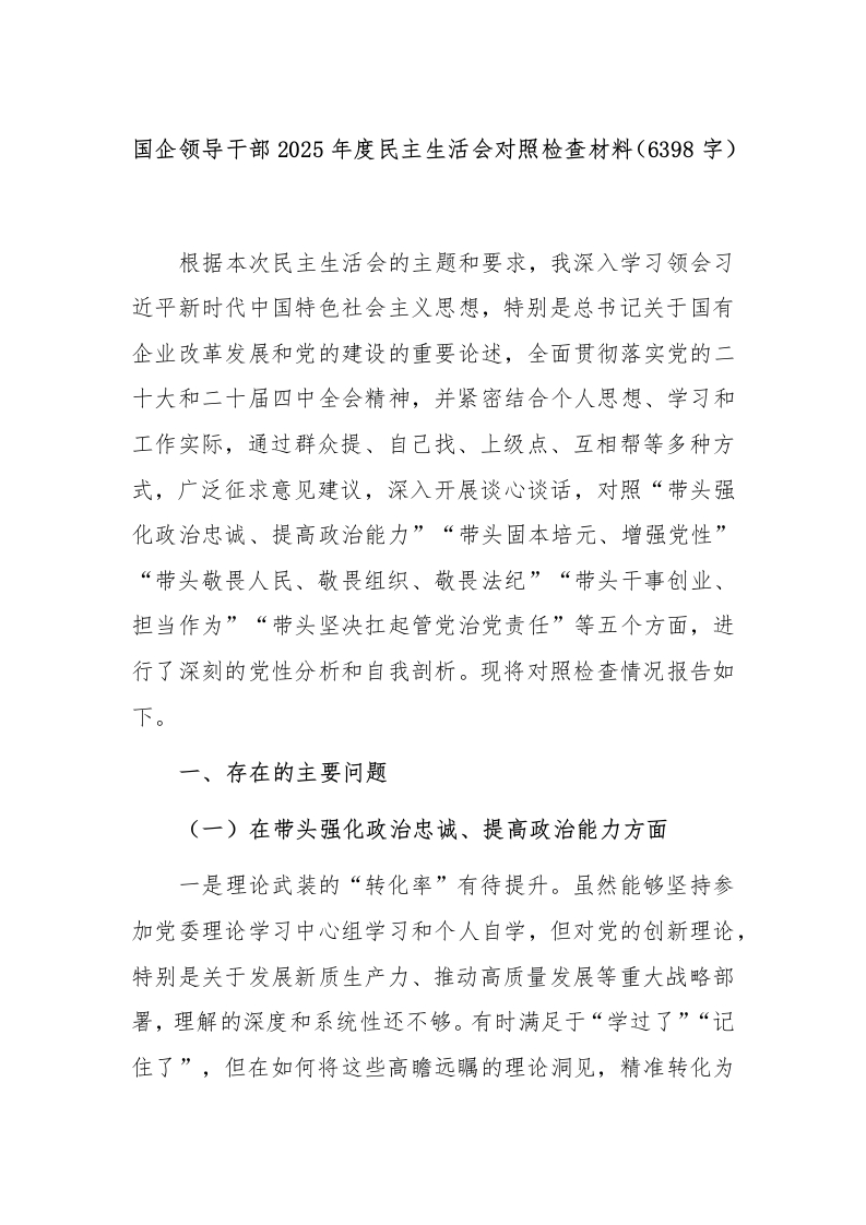 国企领导干部2025年度民主生活会对照检查材料(6398字)