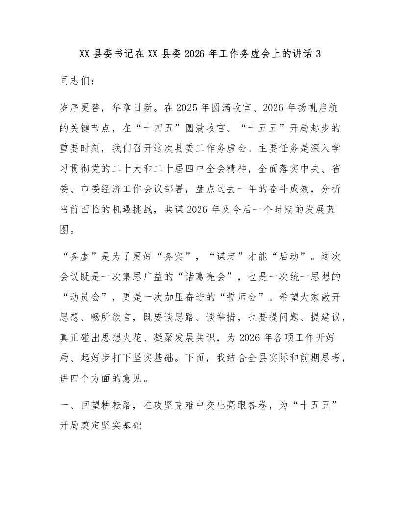 XX县委书记在XX县委2026年工作务虚会上的讲话3