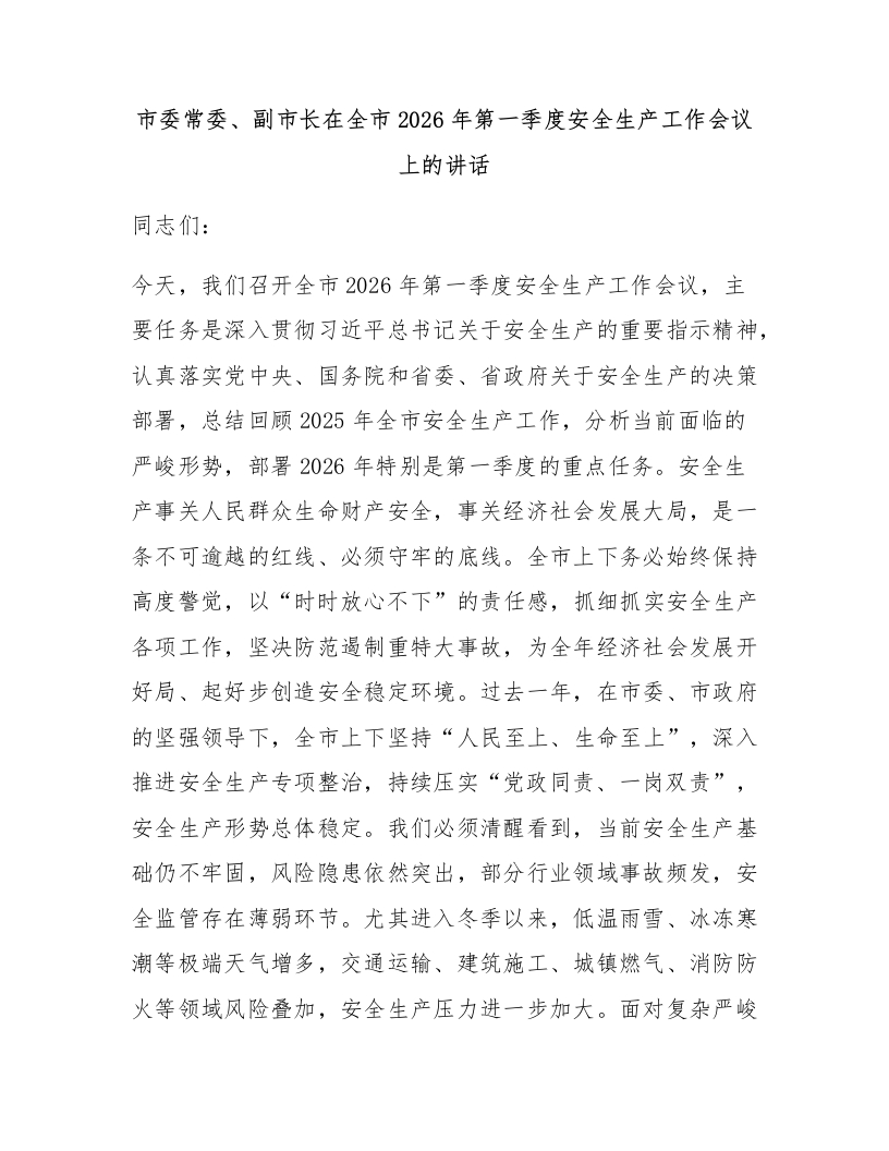 市委常委、副市长在全市2026年第一季度安全生产工作会议上的讲话