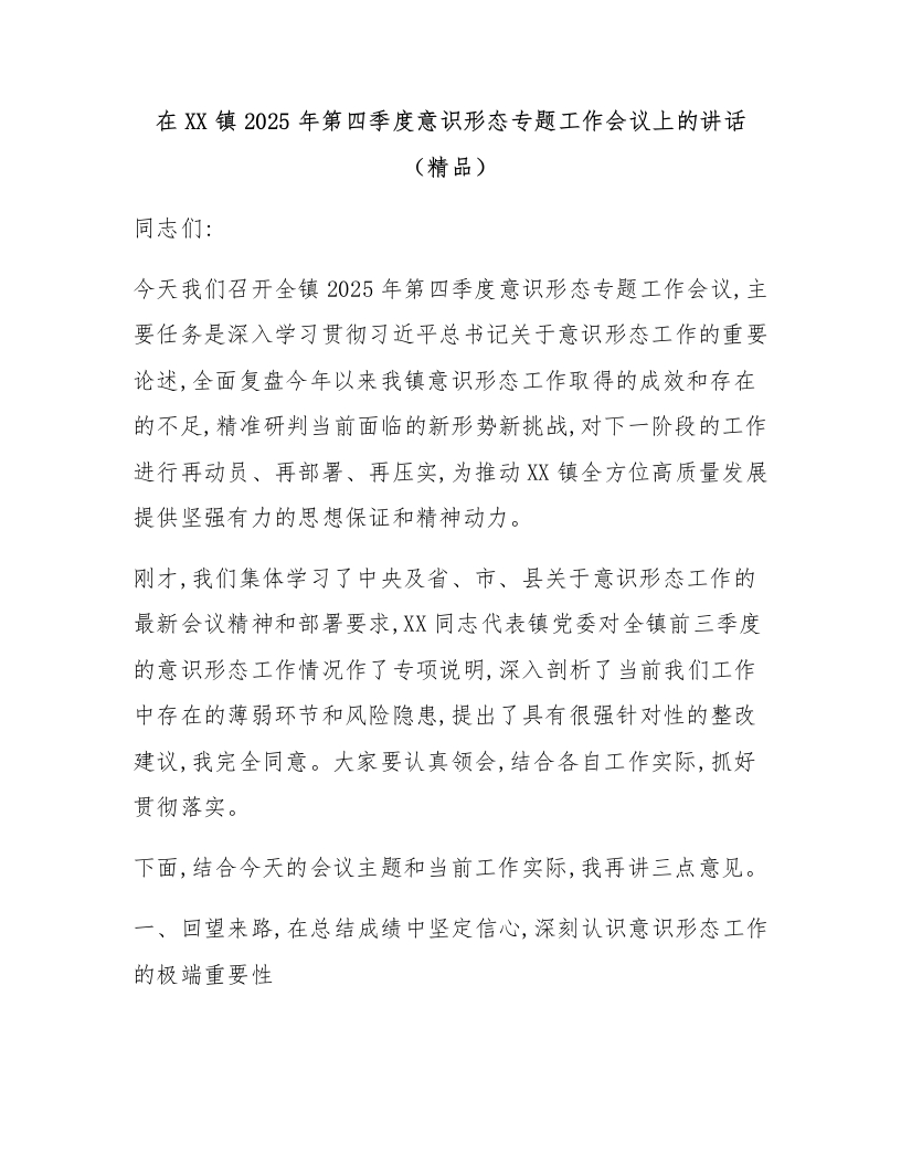 在XX镇2025年第四季度意识形态专题工作会议上的讲话(精品)