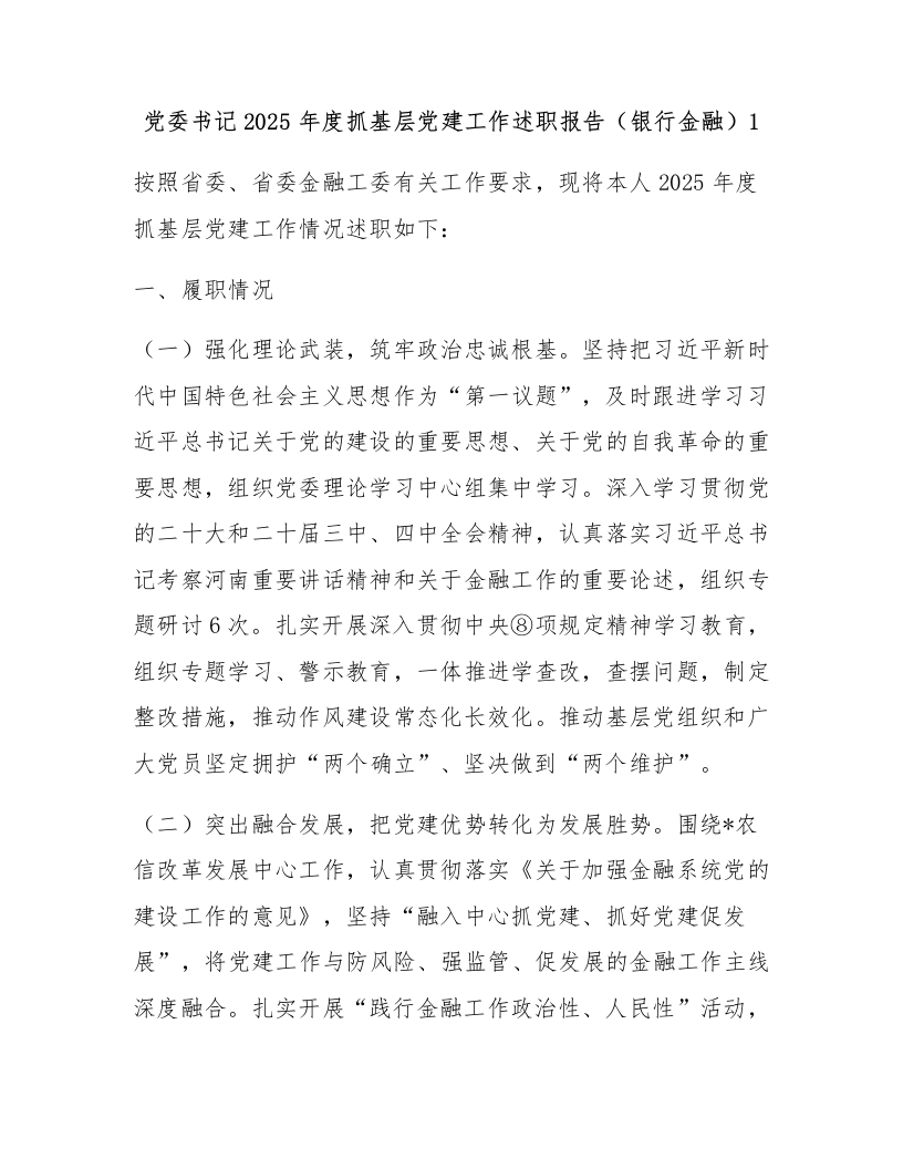 首页热门分类组织生活会党委书记2025年度抓基层党建工作述职报告(银行金融)1