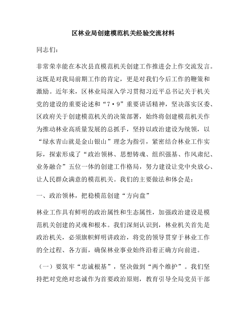 区林业局创建模范机关经验交流材料