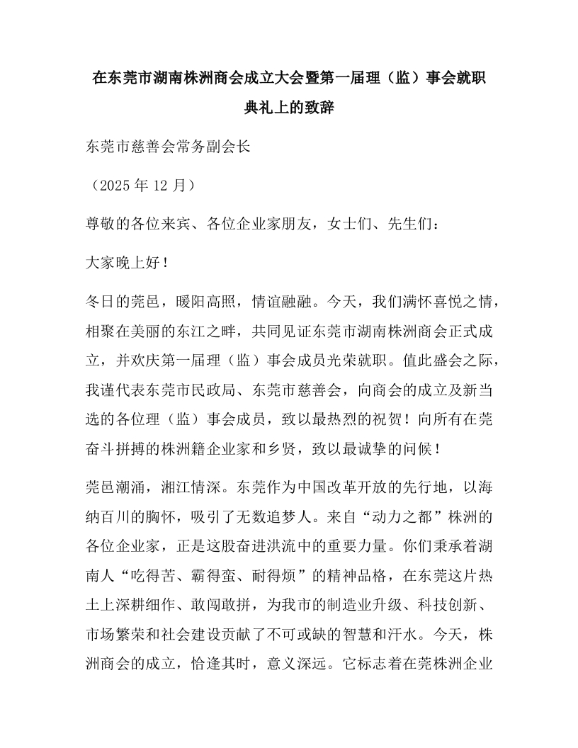 在东莞市湖南株洲商会成立大会暨第一届理(监)事会就职典礼上的致辞