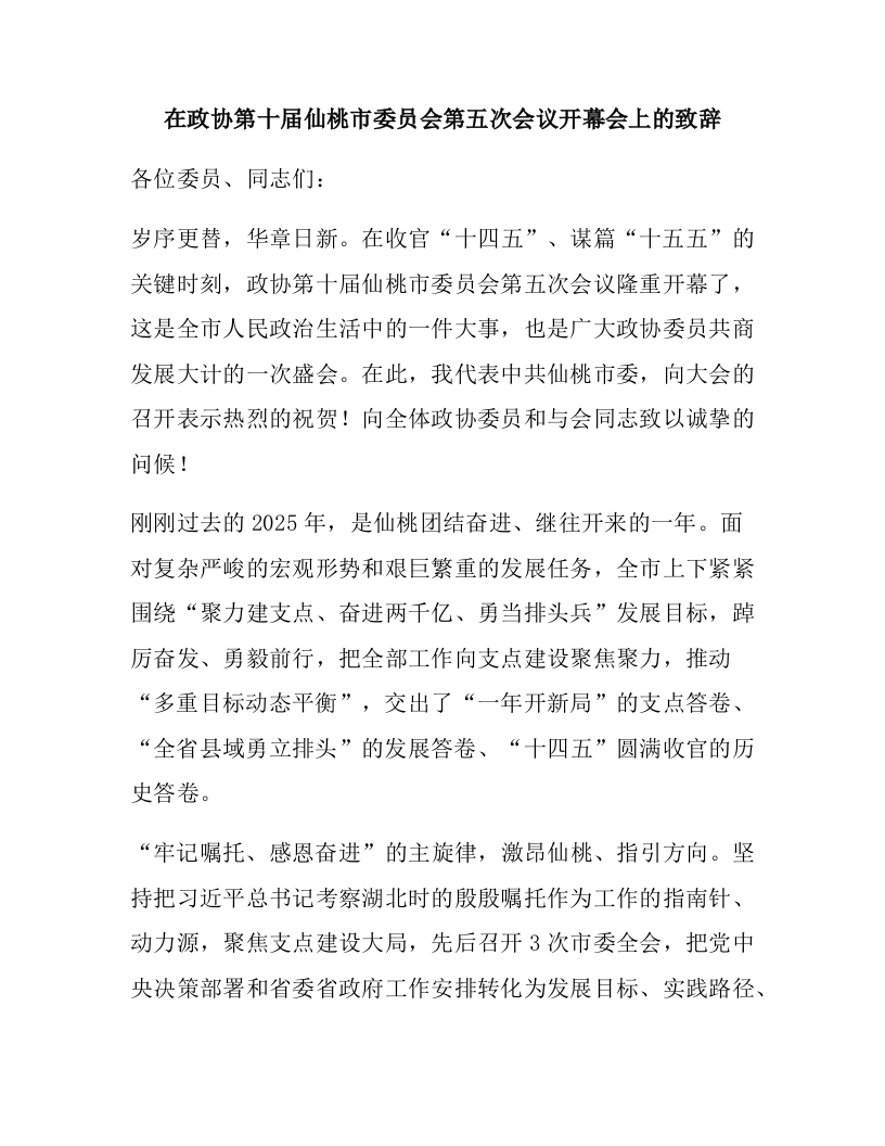 在政协第十届仙桃市委员会第五次会议开幕会上的致辞