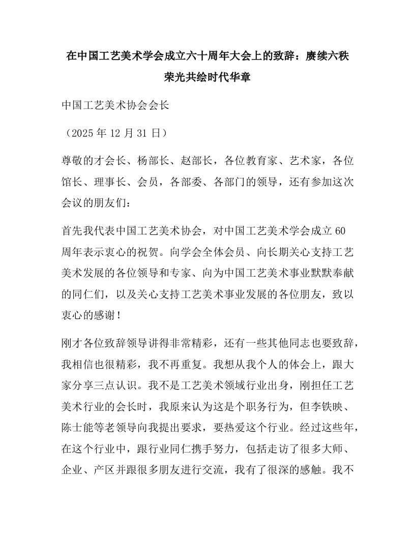 在中国工艺美术学会成立六十周年大会上的致辞:赓续六秩荣光共绘时代华章