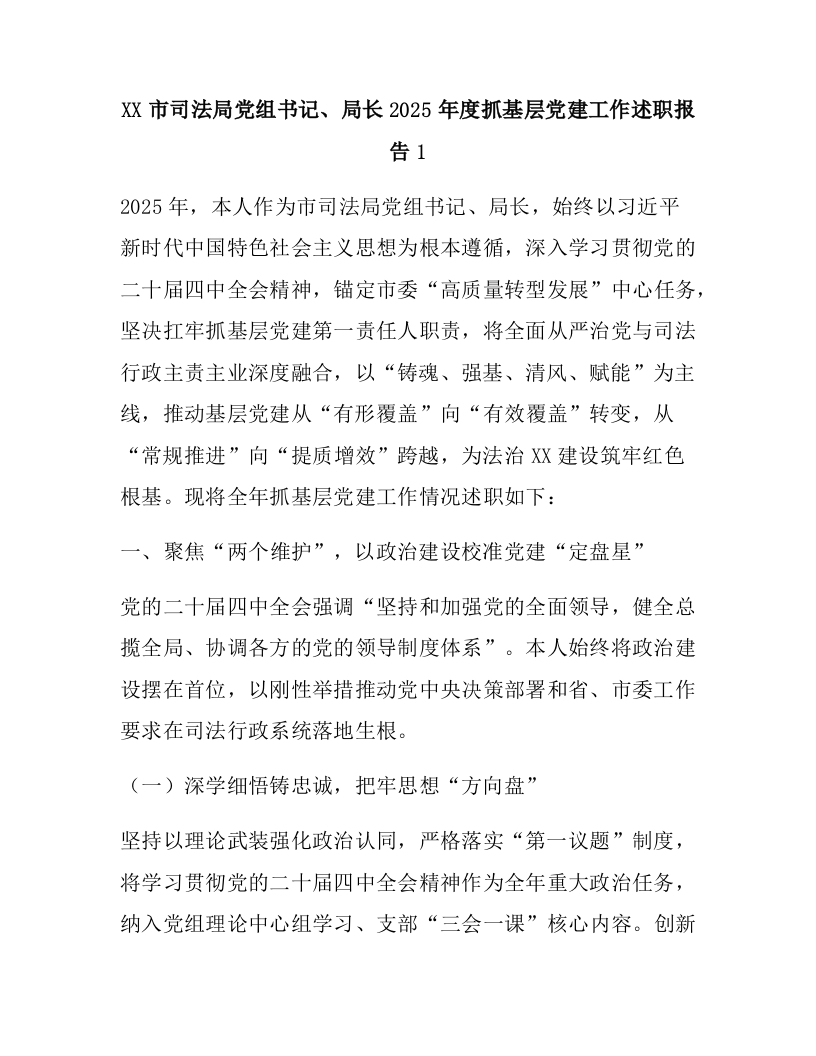 XX市司法局党组书记、局长2025年度抓基层党建工作述职报告1