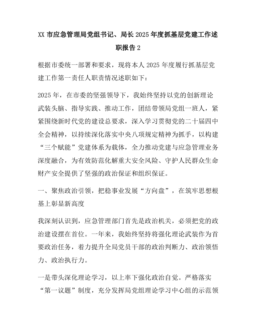 XX市应急管理局党组书记、局长2025年度抓基层党建工作述职报告2