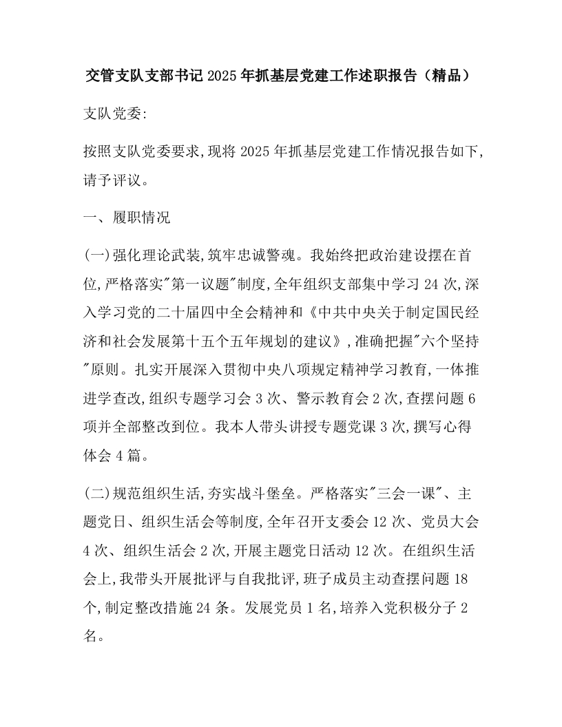 交管支队支部书记2025年抓基层党建工作述职报告(精品)