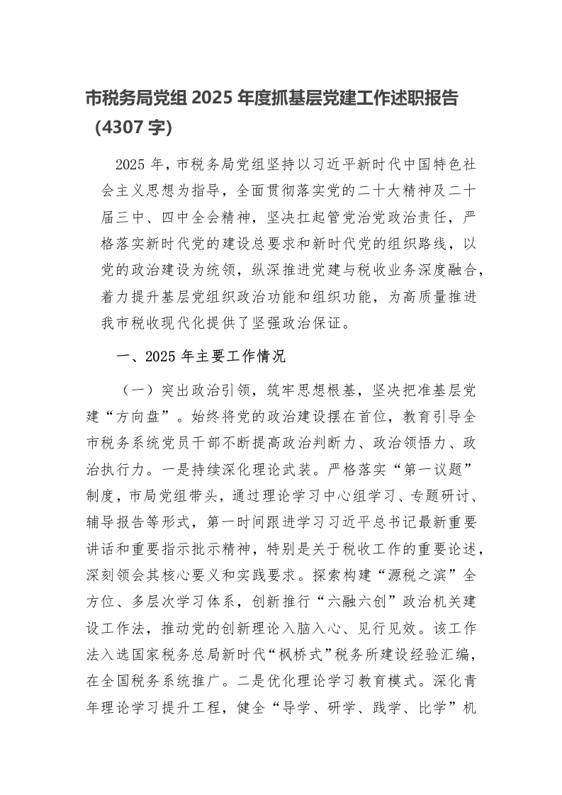 首页党建专栏党建党课市税务局党组2025年度抓基层党建工作述职报告(4307字)