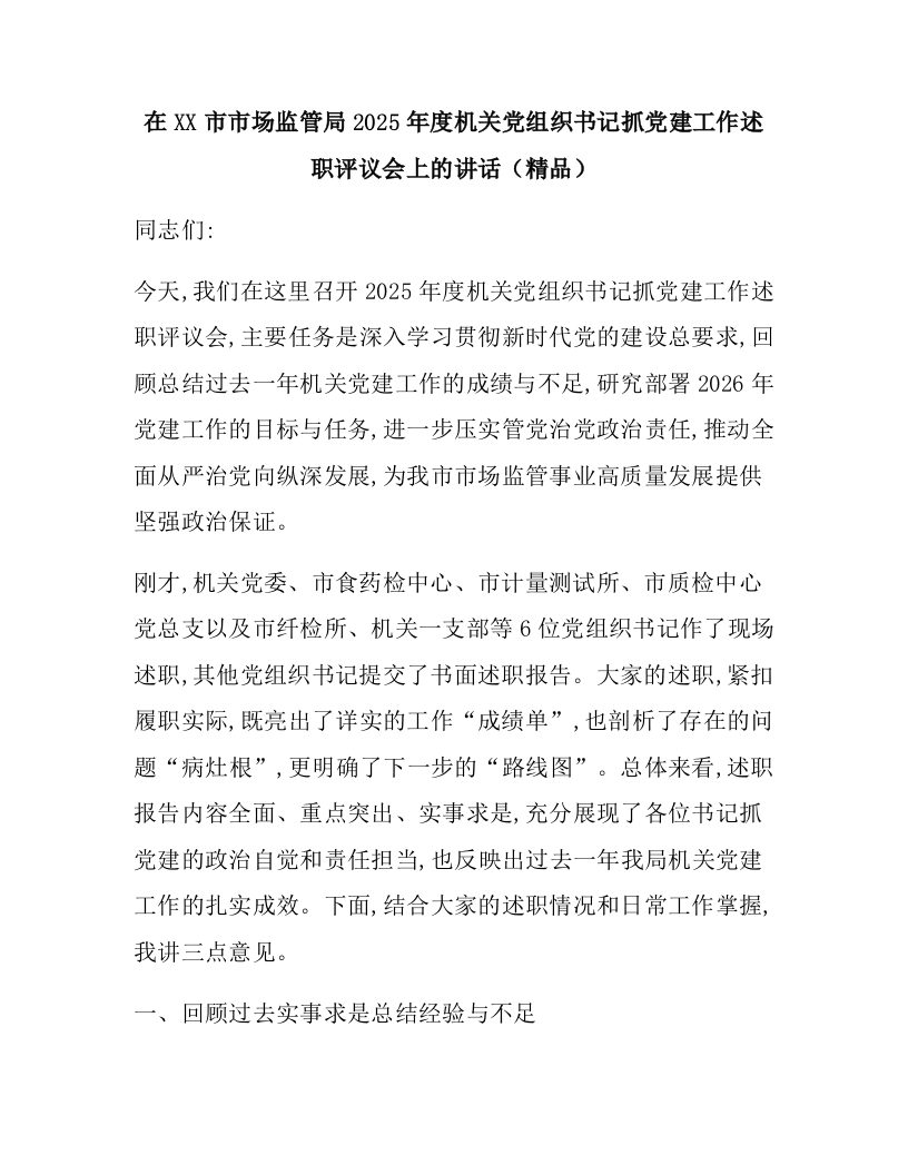 在XX市市场监管局2025年度机关党组织书记抓党建工作述职评议会上的讲话(精品)