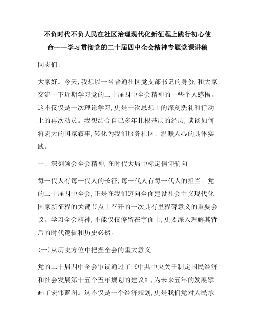 不负时代不负人民在社区治理现代化新征程上践行初心使命——学习贯彻党的二十届四中全会精神专题党课讲稿