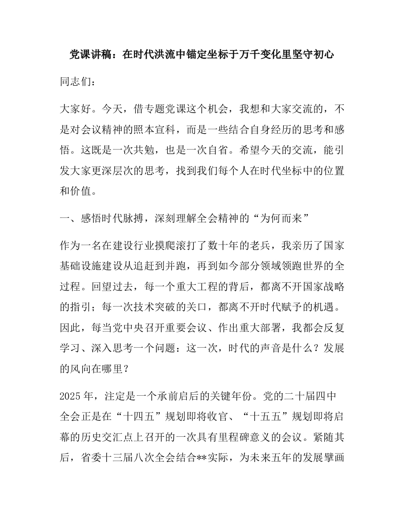 党课讲稿:在时代洪流中锚定坐标于万千变化里坚守初心