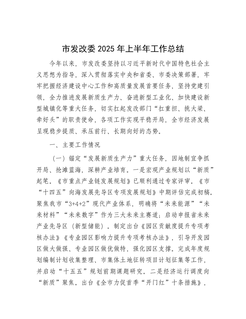 市发改委2025年上半年工作总结