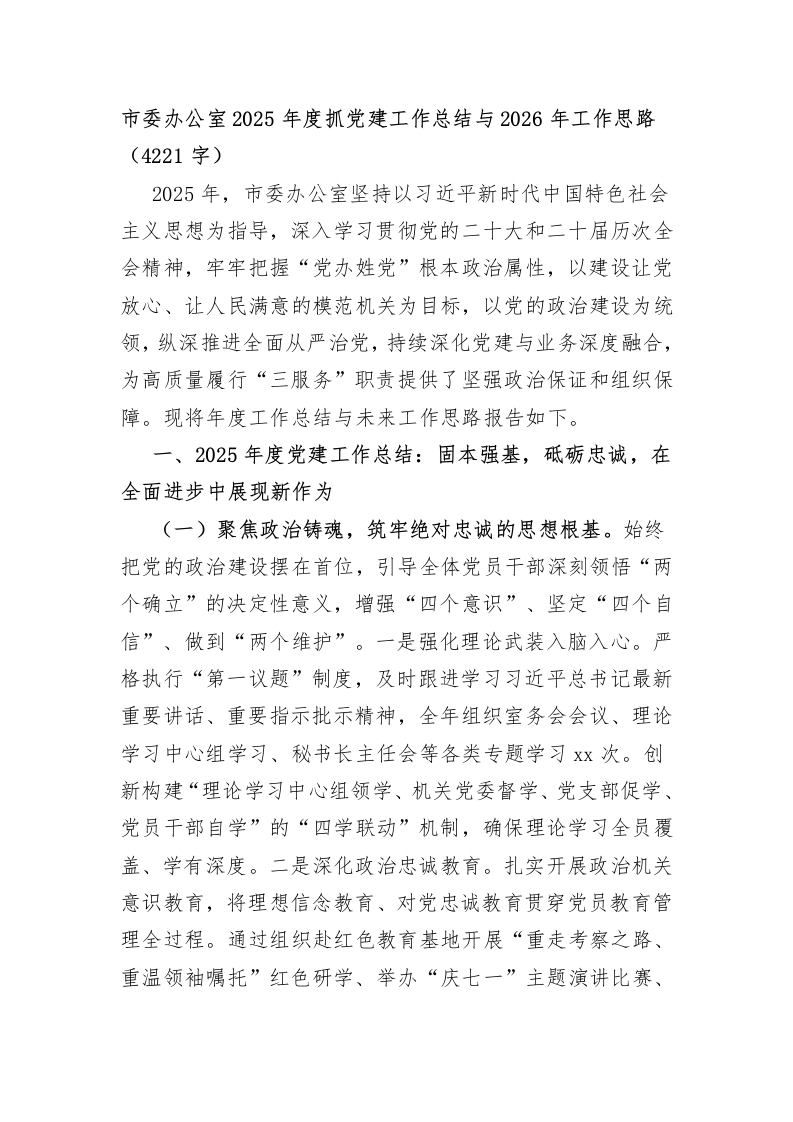 市委办公室2025年度抓党建工作总结与2026年工作思路(4221字)