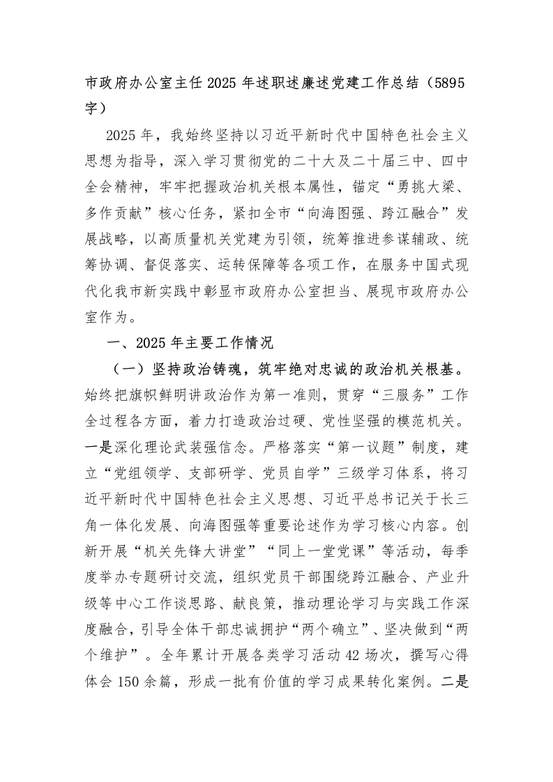 首页热门分类工作总结市政府办公室主任2025年述职述廉述党建工作总结(5895字)