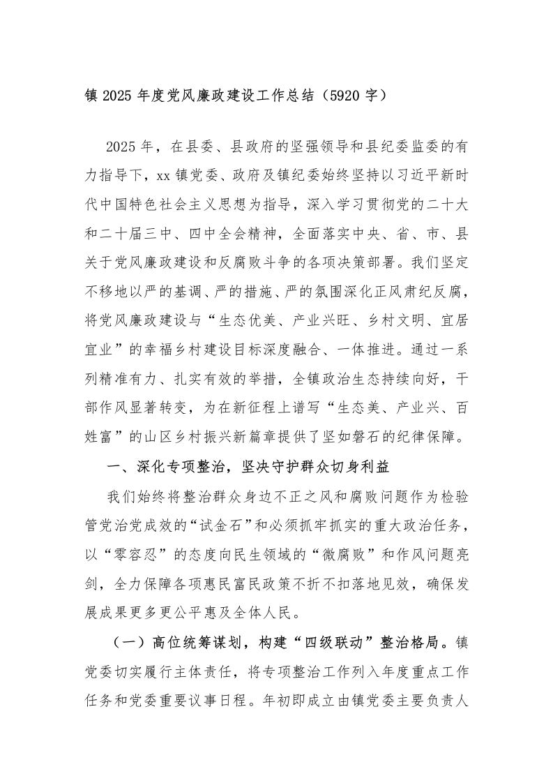 镇2025年度党风廉政建设工作总结(5920字)