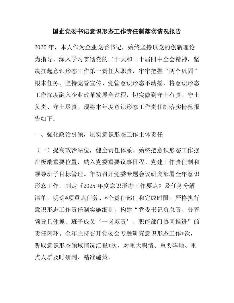 首页国企银行专区国企材料国企党委书记意识形态工作责任制落实情况报告