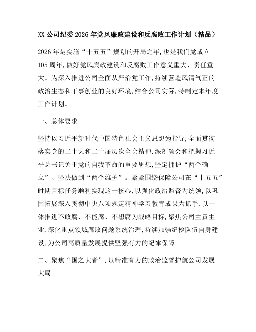 XX公司纪委2026年党风廉政建设和反腐败工作计划(精品)