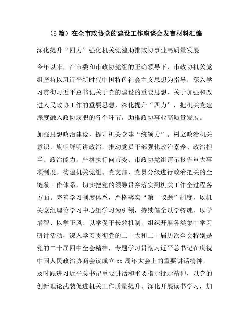 (6篇)在全市政协党的建设工作座谈会发言材料汇编