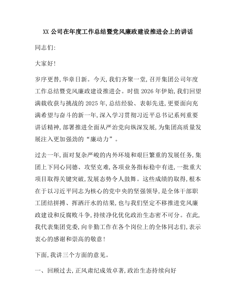 XX公司在年度工作总结暨党风廉政建设推进会上的讲话
