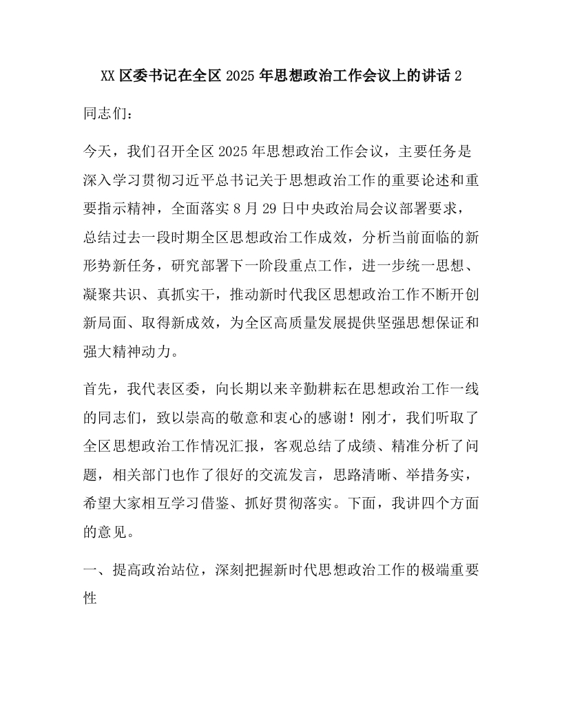 XX区委书记在全区2025年思想政治工作会议上的讲话2