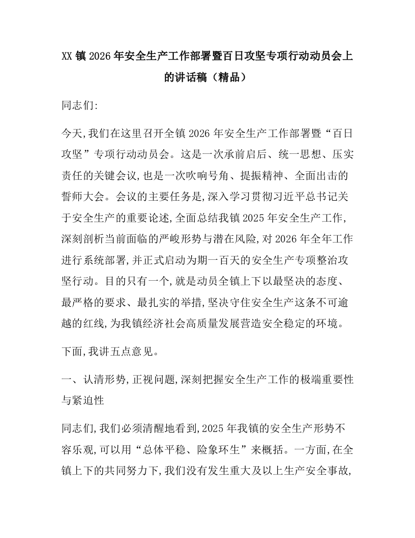 XX镇2026年安全生产工作部署暨百日攻坚专项行动动员会上的讲话稿(精品)