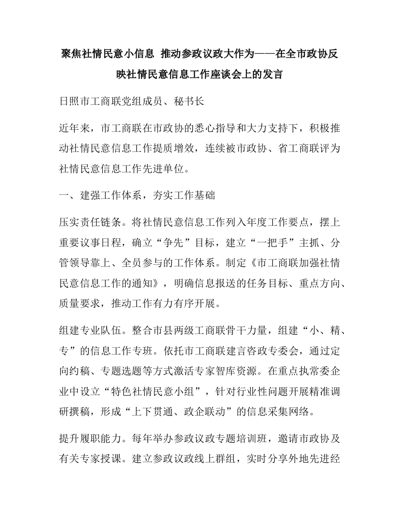 聚焦社情民意小信息 推动参政议政大作为——在全市政协反映社情民意信息工作座谈会上的发言