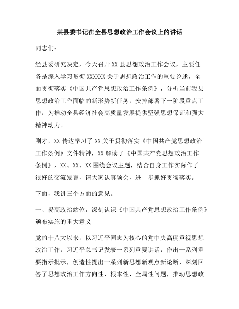 某县委书记在全县思想政治工作会议上的讲话