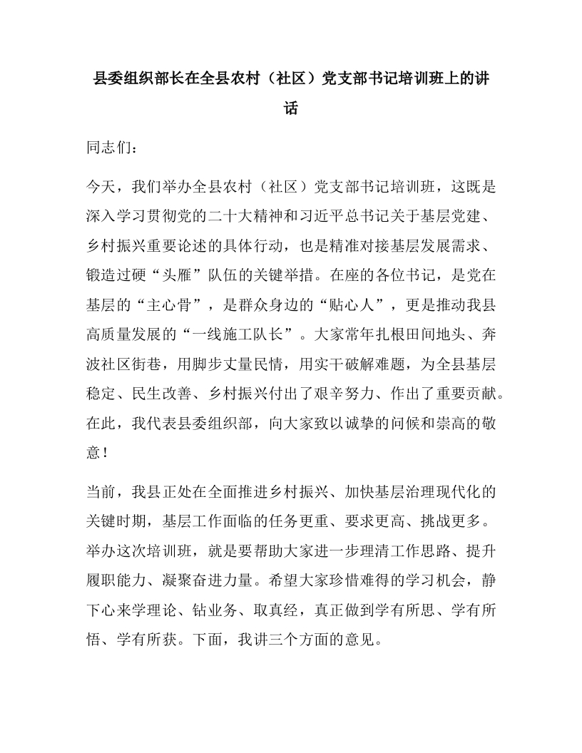 县委组织部长在全县农村(社区)党支部书记培训班上的讲话