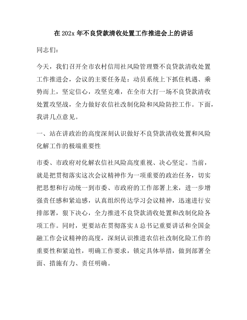 在202x年不良贷款清收处置工作推进会上的讲话