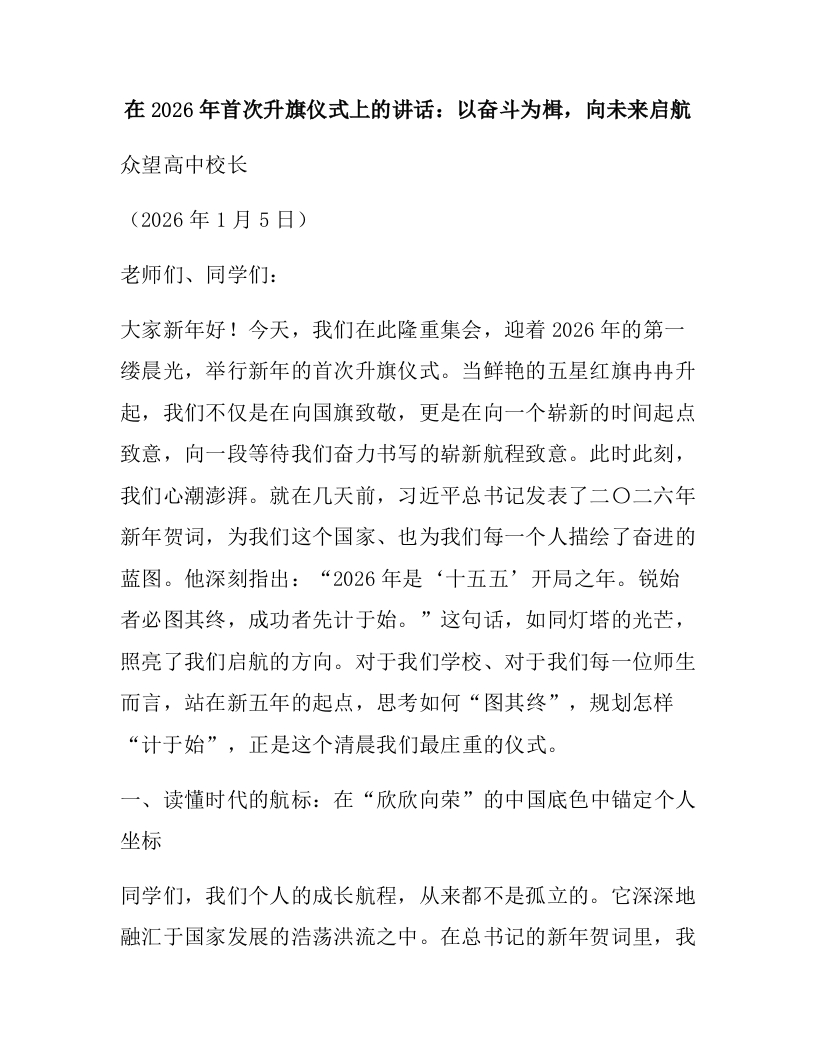 在2026年首次升旗仪式上的讲话:以奋斗为楫,向未来启航