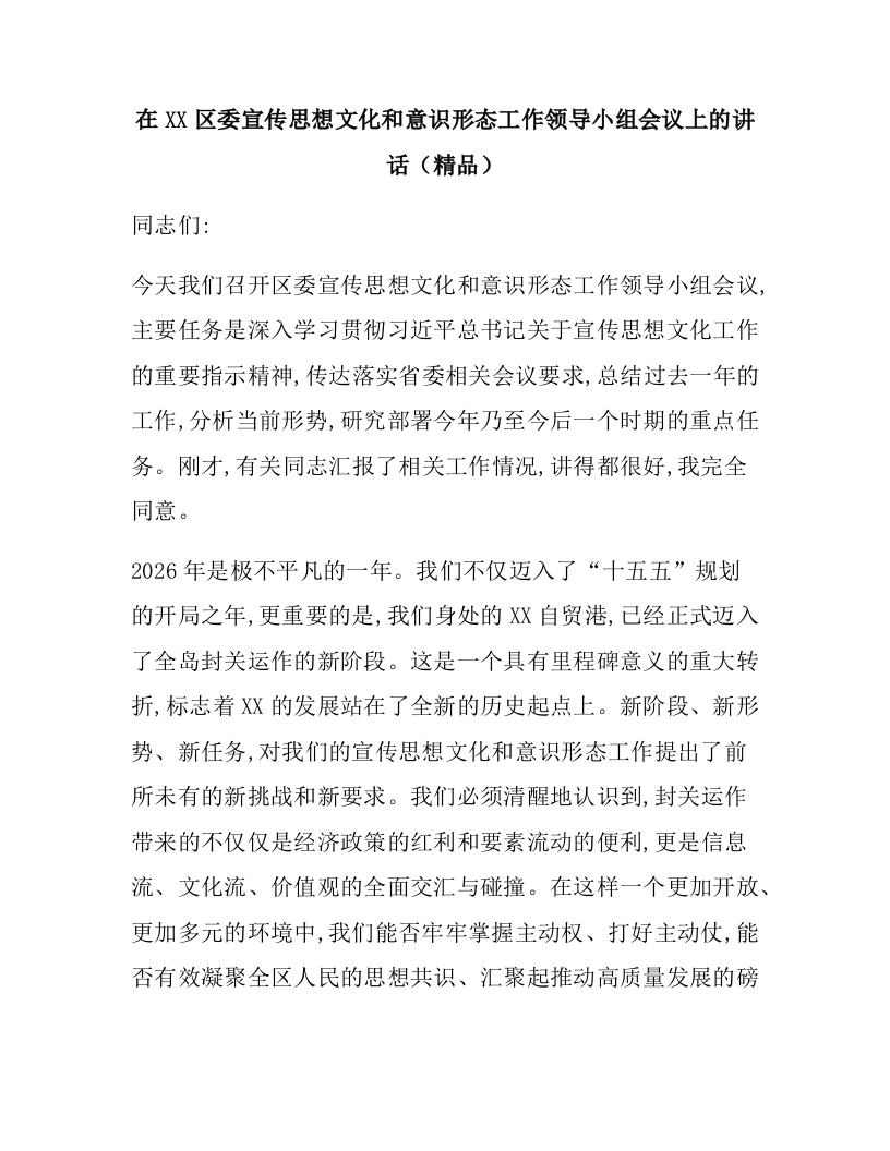 在XX区委宣传思想文化和意识形态工作领导小组会议上的讲话(精品)