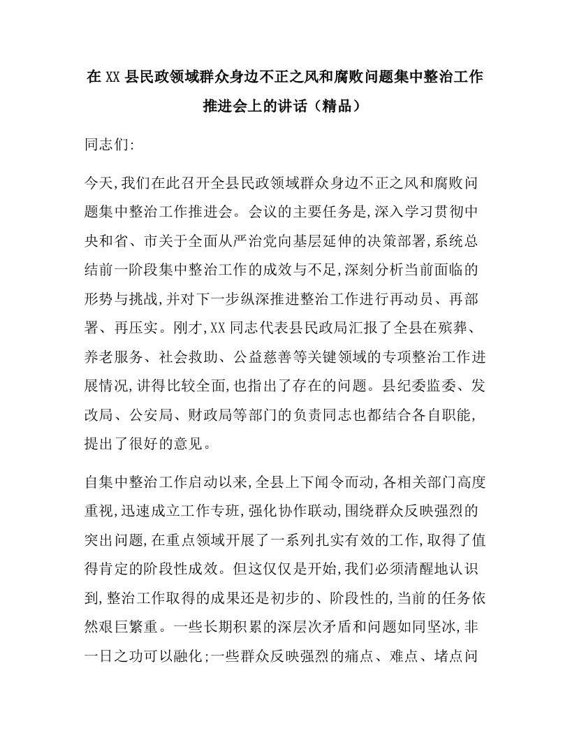 在XX县民政领域群众身边不正之风和腐败问题集中整治工作推进会上的讲话(精品)