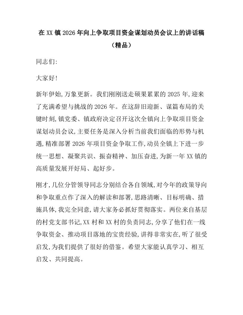 在XX镇2026年向上争取项目资金谋划动员会议上的讲话稿(精品)